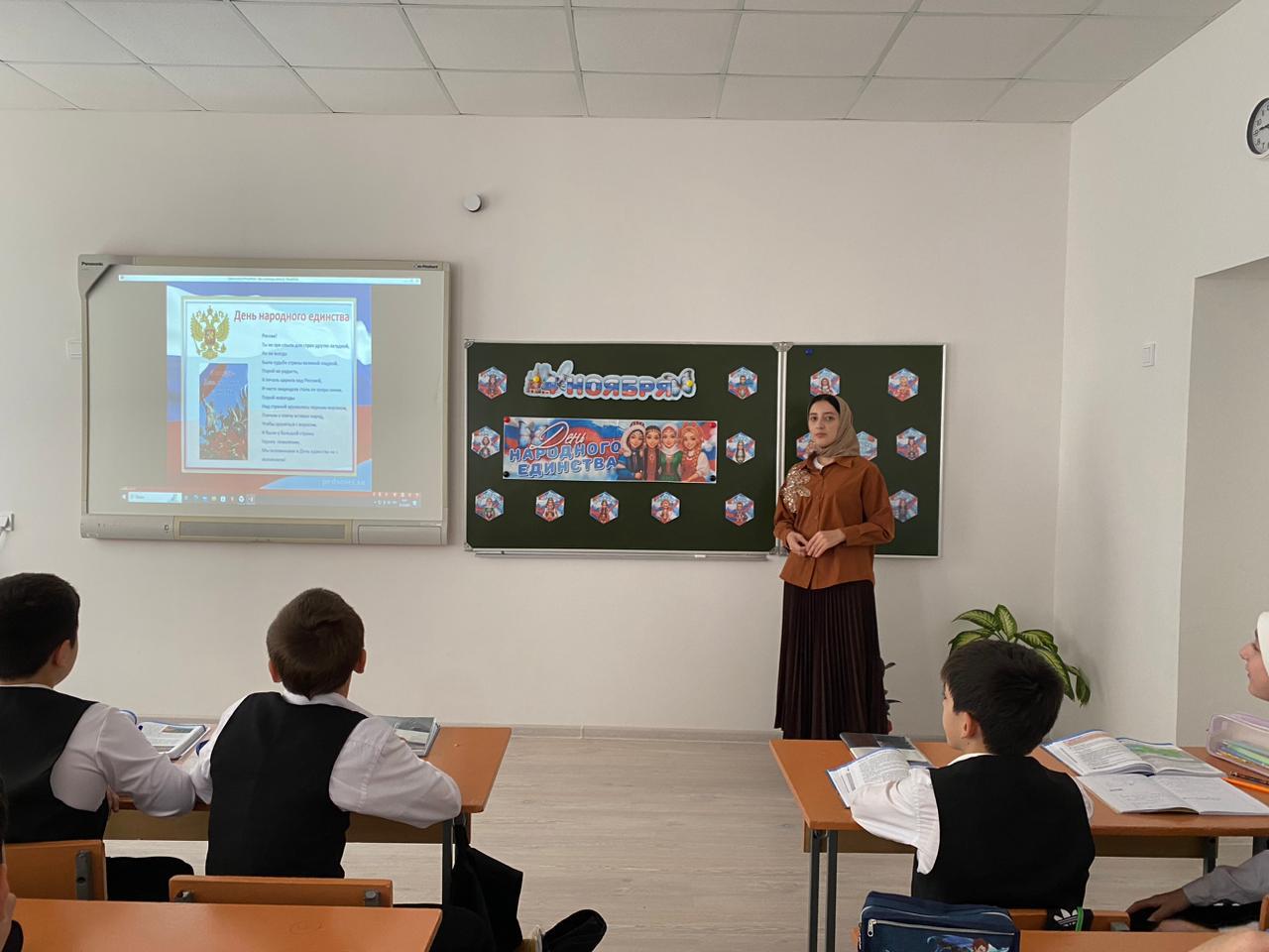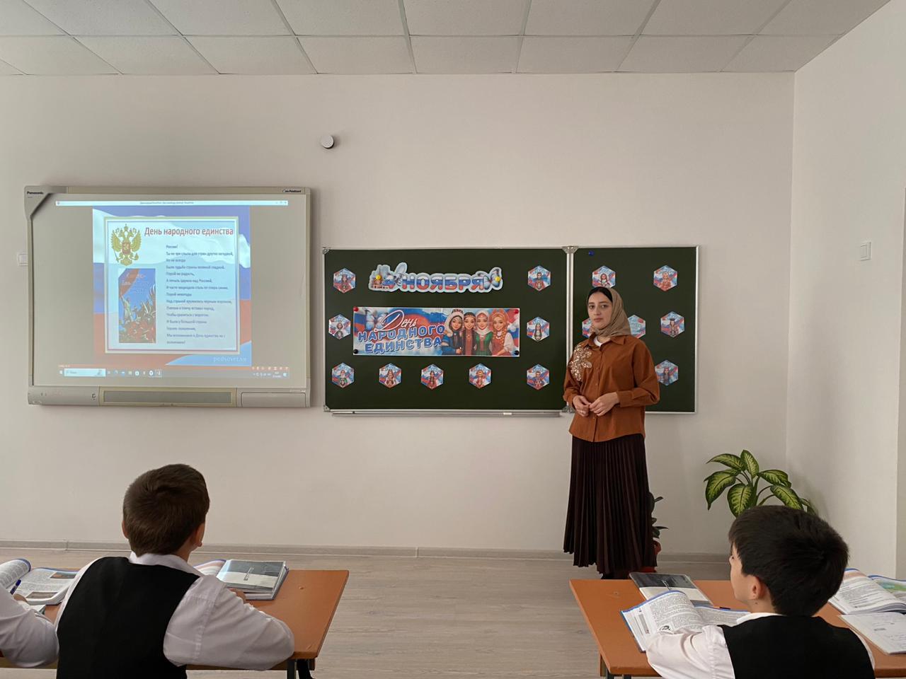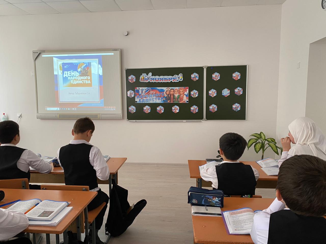 В преддверии Дня народного единства Тарлаева Х.М., учитель истории провела для обучающихся 5Б класса урок истории, приуроченный к празднику.