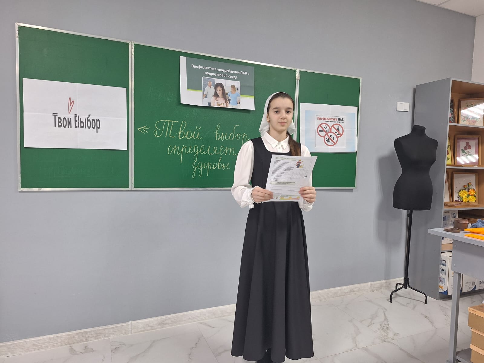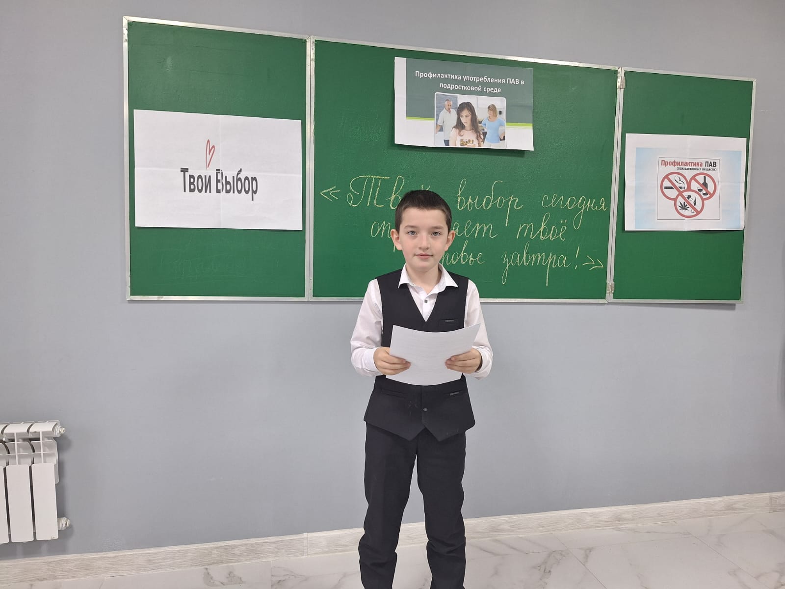 В нашей школе социальным педагогом Серсаевой Л. Х. успешно была проведена акция «Твой выбор», в которой приняли участие учащиеся 3–6 классов. Мероприятие было направлено на формирование навыков принятия решений и умение аргументировать свою точку зрения.