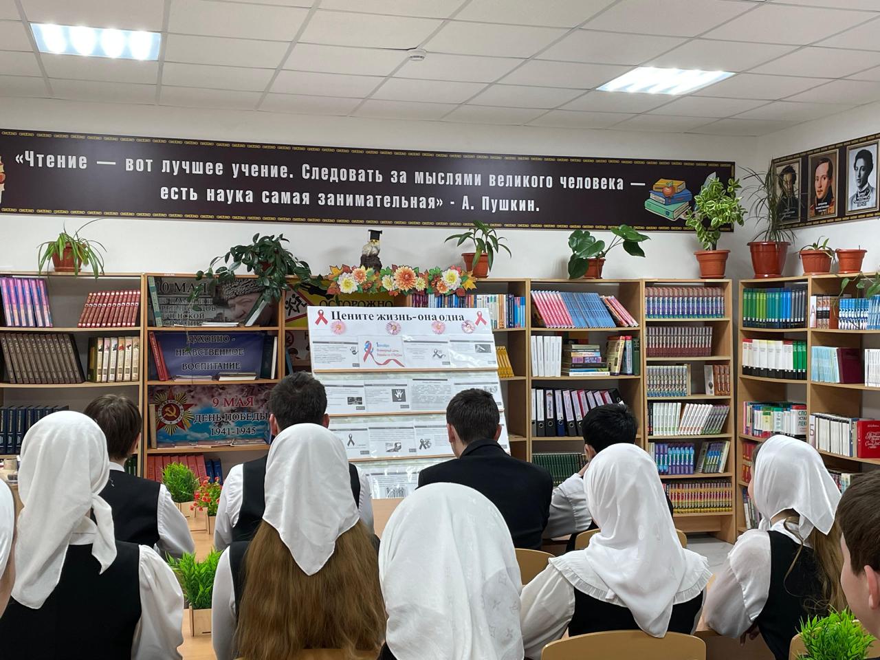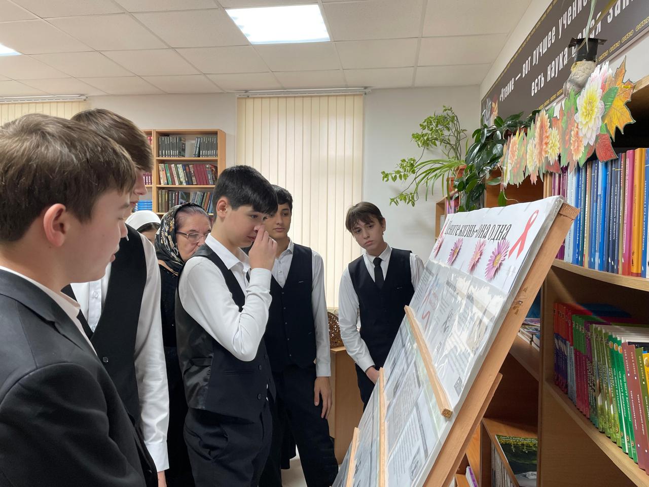 Заведующая библиотекой Джабаева Масра Абусупьяновна организовала специализированную экспозицию книг и журналов, посвящённых различным аспектам проблемы ВИЧ/СПИДа. Для старшеклассников была проведена экскурсия, на которой раскрылись важные медицинские и социальные аспекты вопроса.