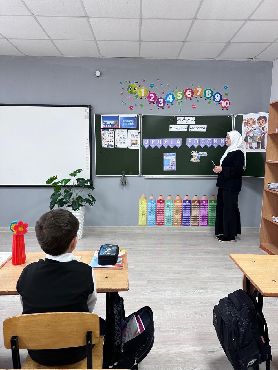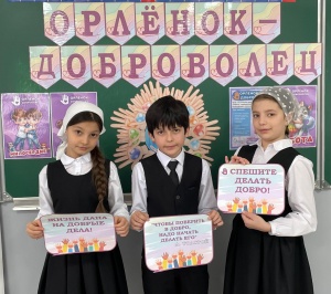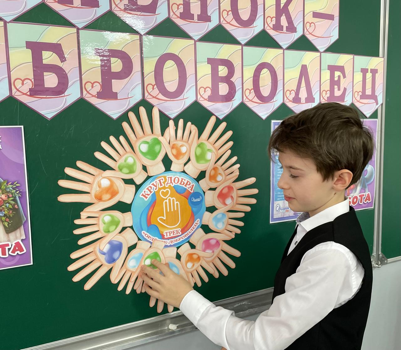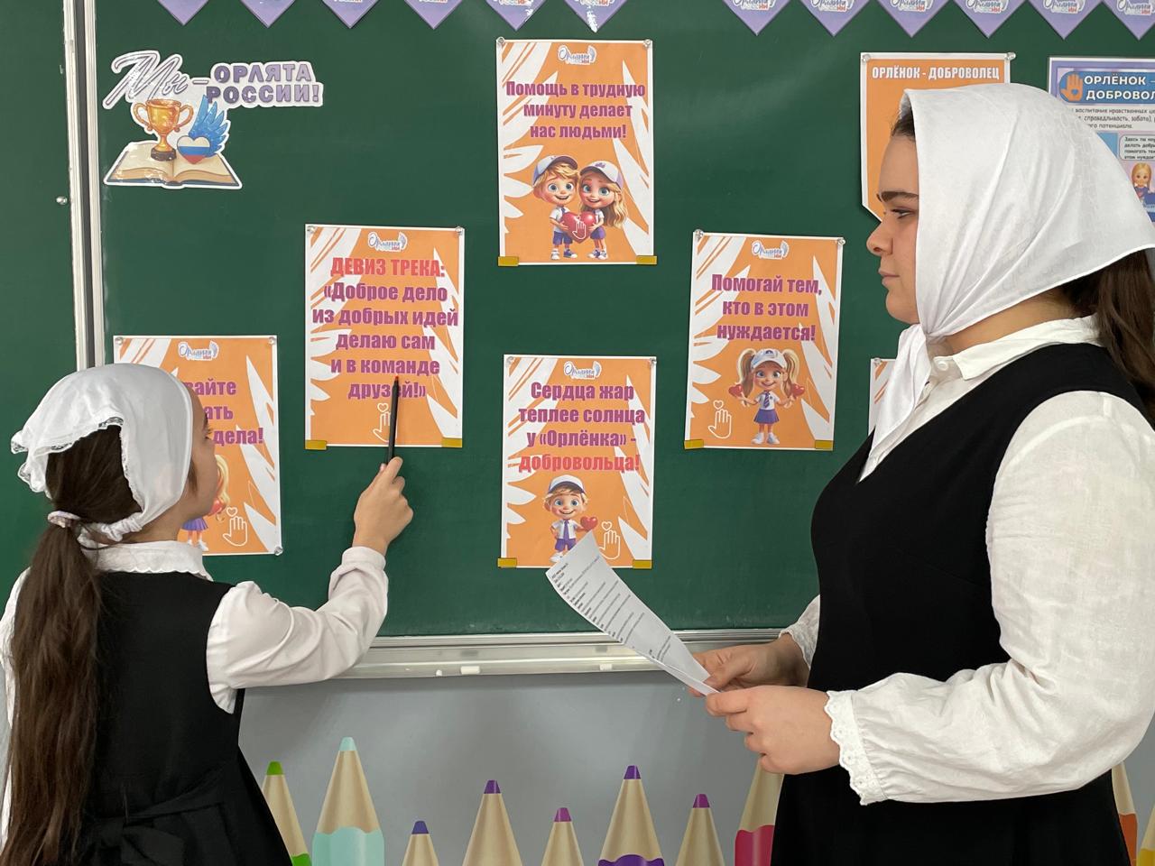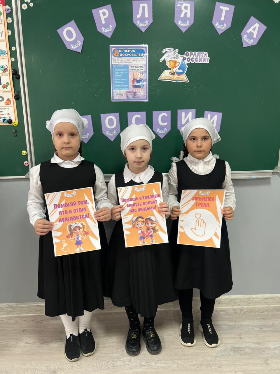 Программа «Орлята России» включает трек «Орлёнок — Доброволец», который направлен на воспитание в детях желания помогать окружающим, прививать уважение к труду и формировать волонтерские качества. В течение учебного года педагоги начальных классов проводят цикл тематических занятий, посвященных важным аспектам социальной активности, таким как взаимовыручка, забота о близких людях, создание положительного настроя и совершение добрых поступков бескорыстно.