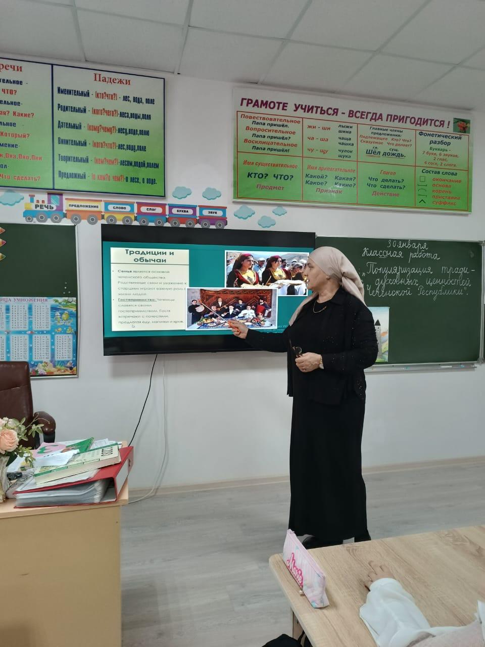 Во время занятия учитель познакомила ребят с основными принципами нравственности и морали, заложенными в традициях чеченского народа. Ученики узнали о семейных устоях, уважительном отношении к старшим, гостеприимстве и значимости сохранения национальных традиций.