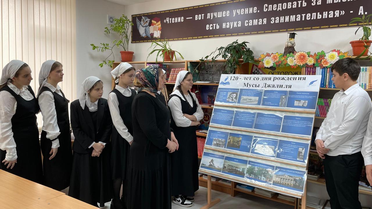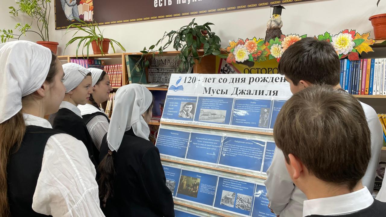 Заведующая библиотекой Джабаева Масра Абдусупьяновна подготовила специальную книжную выставку для учащихся нашей школы, приурочив её ко дню памяти выдающегося татарского поэта и Героя Советского Союза Мусы Джалиля.