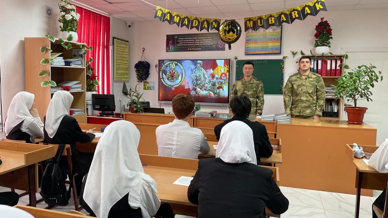 В качестве почётных гостей в школу прибыли представители войсковой части г. Шелковская: сержант Исмухамбетов Э.Х. и прапорщик Абдулаев И.М. Они подробно рассказали старшеклассникам об истории создания войск, их задачах по охране общественного порядка и обеспечении безопасности граждан.