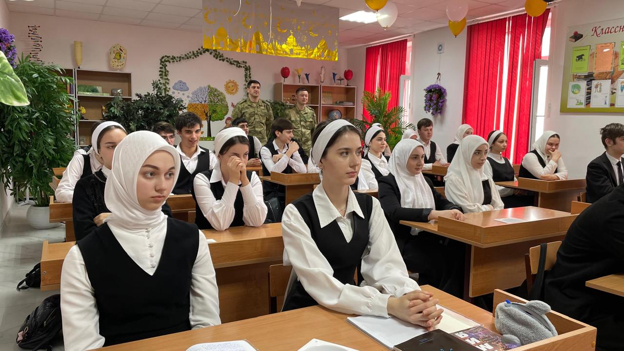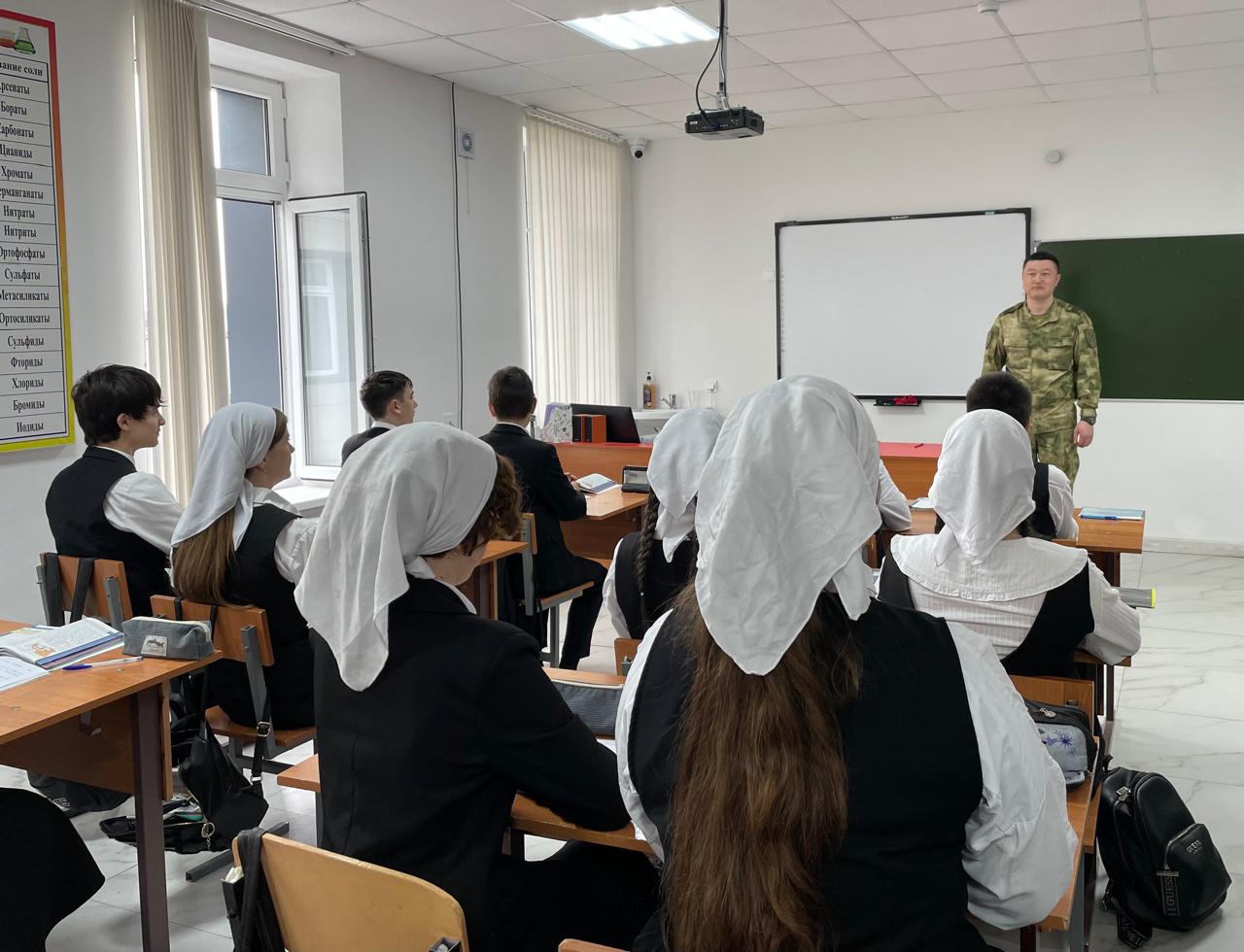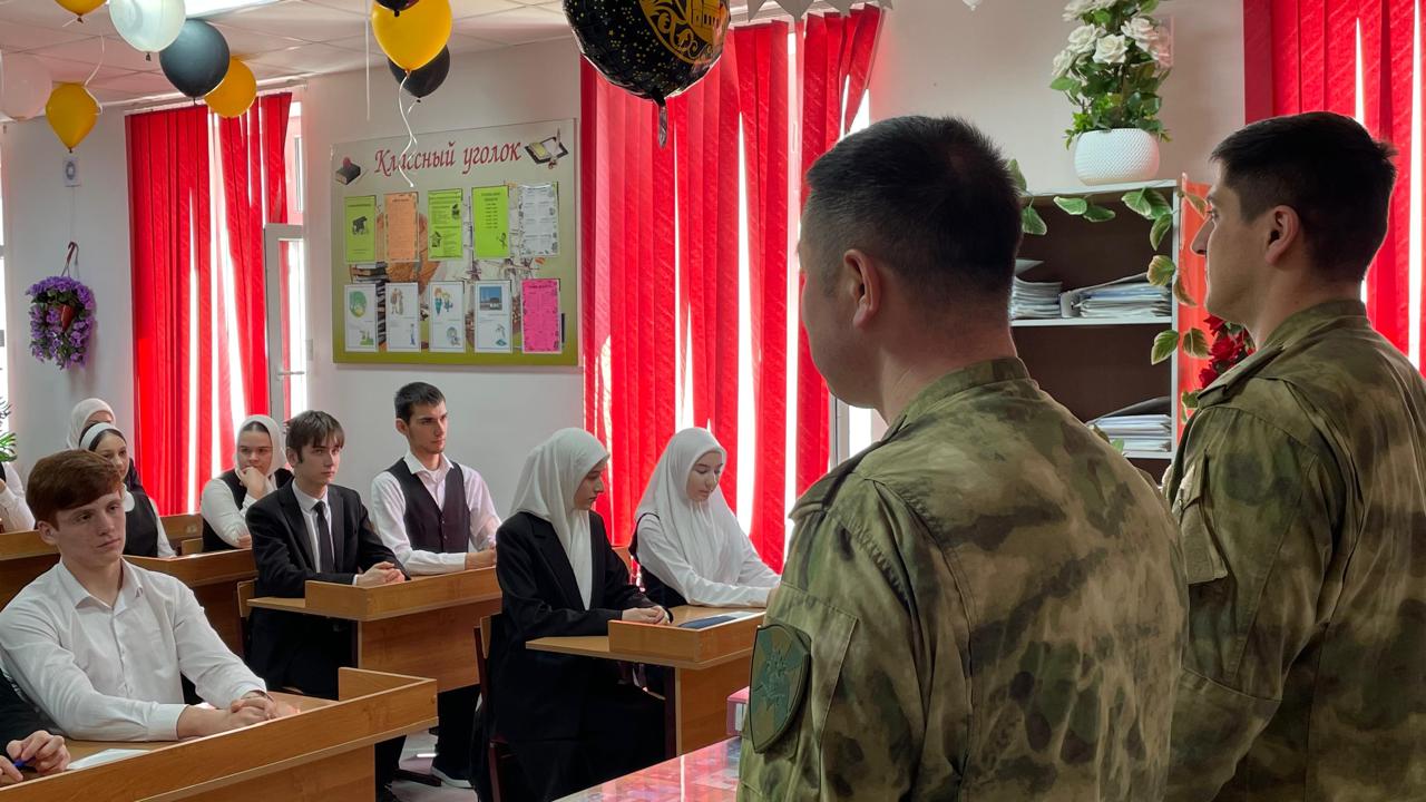 Профориентация в нашей школе является одним из ключевых направлений воспитательной работы. В связи с этим представители в/ч г. Шелковская — сержант Исмухамбетов Э. Х. и прапорщик Абдулаев И. М. — провели для обучающихся 10-го класса урок, посвящённый агитации выбора военной профессии.