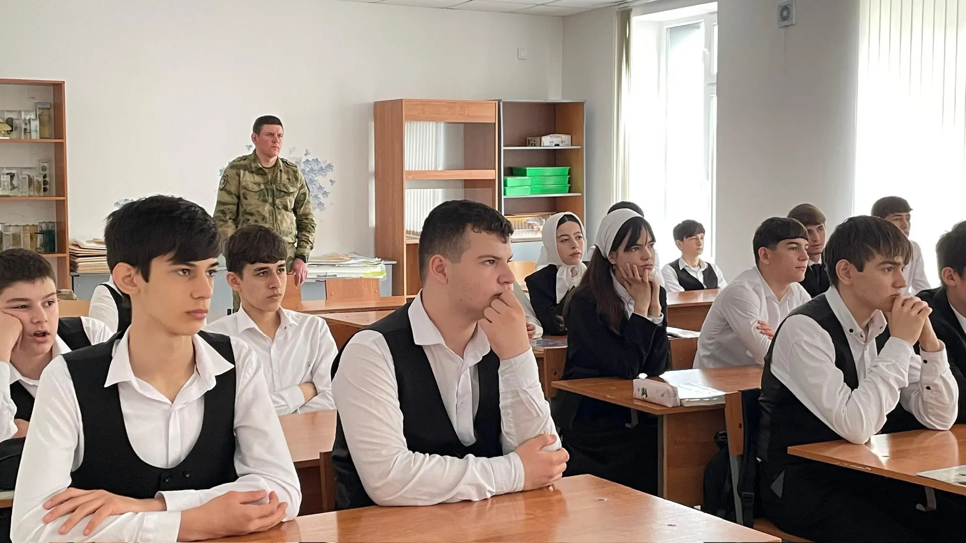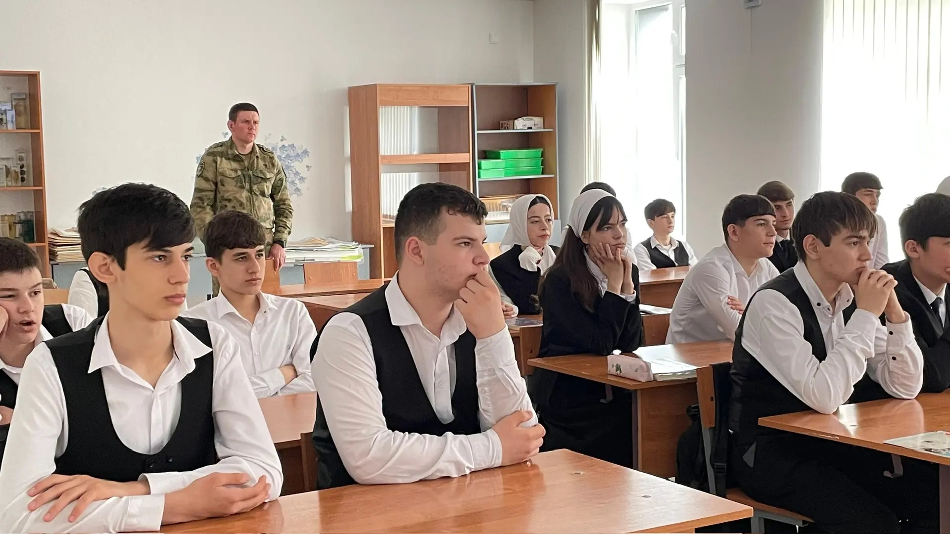 Урок мужества прошёл в формате живого диалога. Ученики 9-А класса с большим интересом слушали рассказ, задавали вопросы о службе, мужестве и долге.